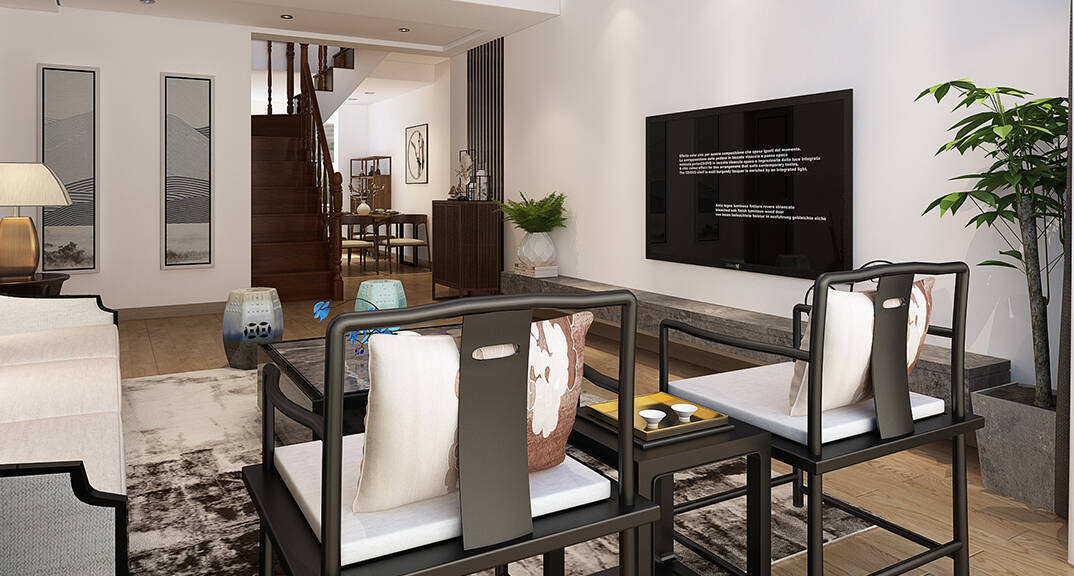 麗都國際310㎡別墅客廳現(xiàn)代中式風格裝修案例效果圖