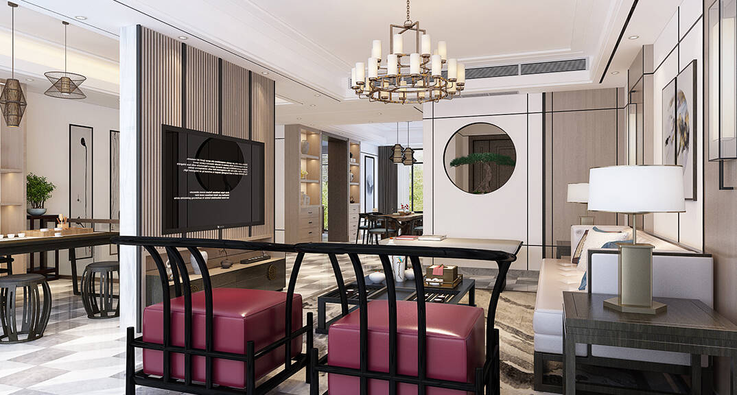通過(guò)客廳、茶室優(yōu)化空間動(dòng)線,門(mén)廳圓形隱蔽隔斷,天圓地方。地面采用了新中式黑灰白色三基色,體現(xiàn)中式文化中低調(diào)內(nèi)斂的生活方式。