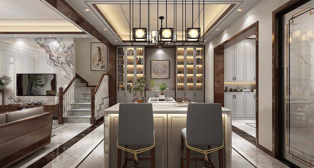 每個家庭的裝修中都需要擁有功能性的設計,這也是一個家居裝修中最主要的目的。新中式風格的設計理念也體現(xiàn)出了功能性的設計。比如西餐廳加入大理石島臺的設計,既體現(xiàn)其視覺上的美感,又具有實用性。