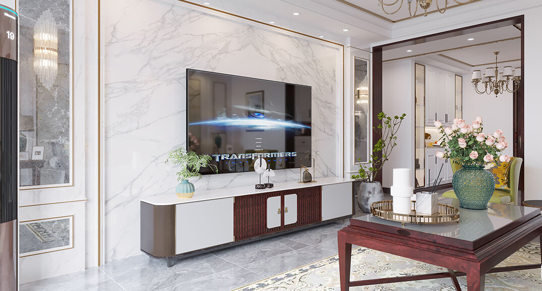 客廳采用簡潔的石膏裝飾線條吊頂,搭配精致的吊燈,營造出一種浪漫的感覺。以大理石作為電視背景墻和地面裝飾材料,光澤感極佳,在沙發(fā)區(qū)鋪上大幅棕灰色地毯,使空間區(qū)域劃分更加清晰。沙發(fā)運用灰色調(diào)與地面顏色相呼應(yīng),拉大了空間感,搭配白色的墻面,襯托出獨具一格的知性魅力。