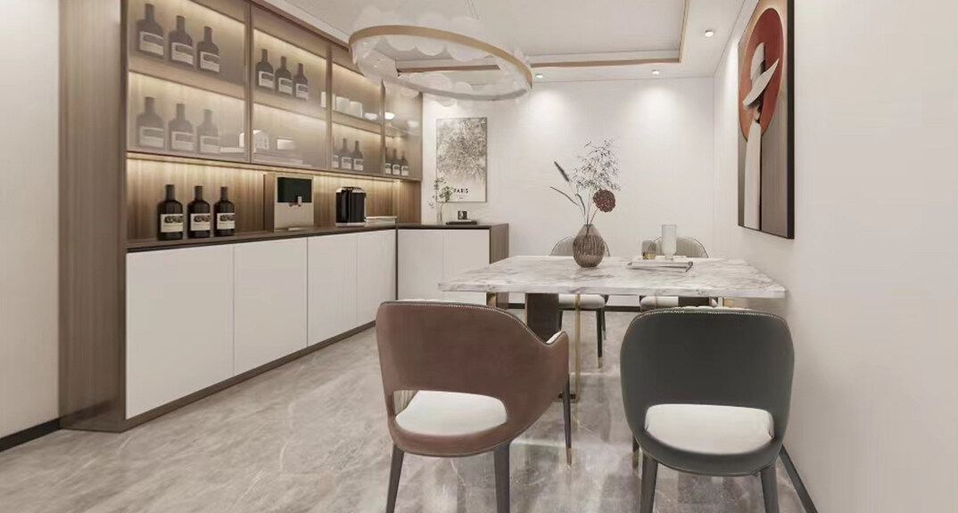 魯商藍岸公館124㎡三室二廳餐廳現(xiàn)代中式風(fēng)格戶型研發(fā)案例效果圖