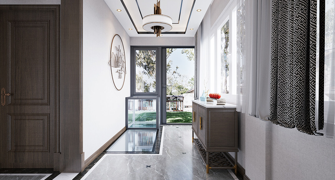 紫荊閣150㎡別墅下疊入戶玄關(guān)新中式風(fēng)格裝修案例效果圖