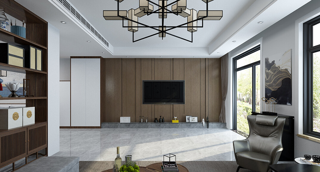 白鷺灣230㎡H戶型客廳電視新中式風格裝修案例效果圖