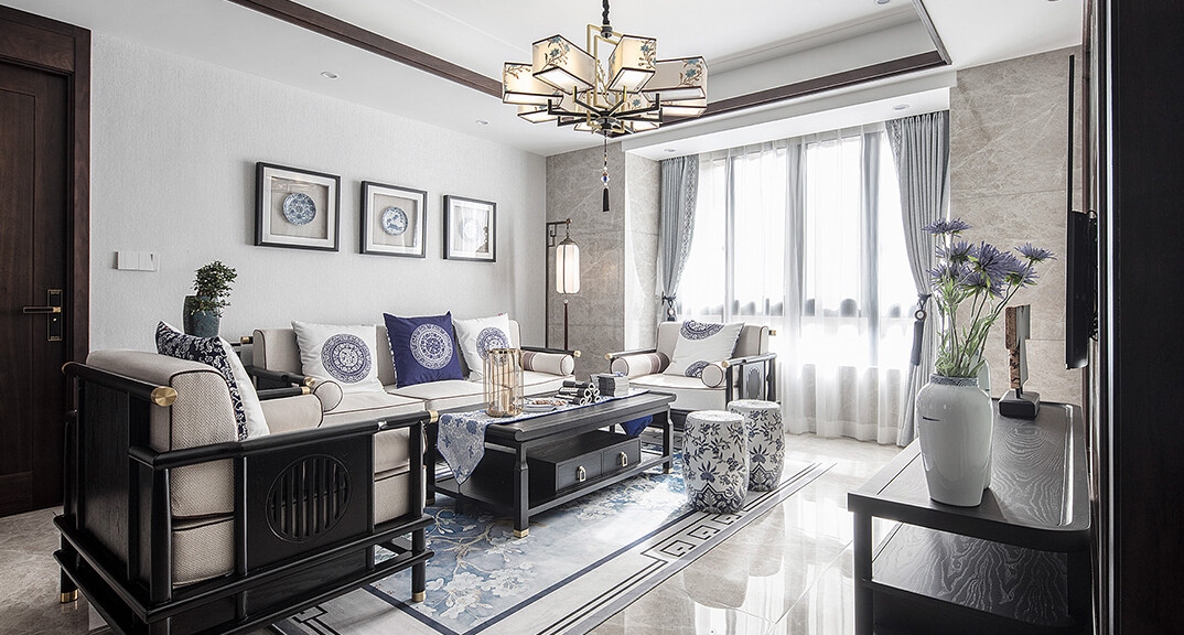 青特星城142㎡三室兩廳客廳新中式風(fēng)格裝修案例效果圖