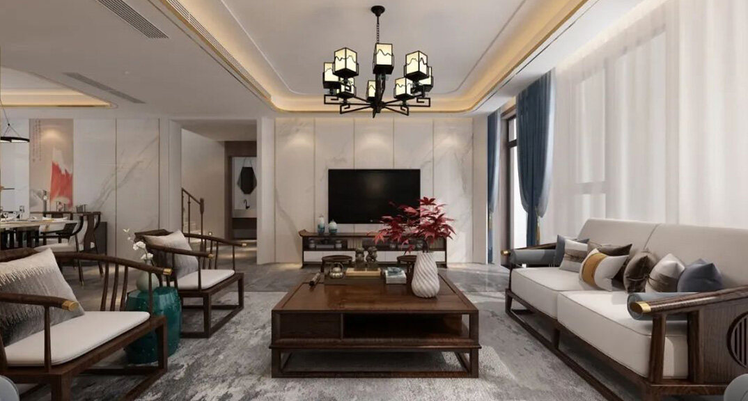 山水龍庭300㎡別墅客廳新中式風格裝修案例效果圖