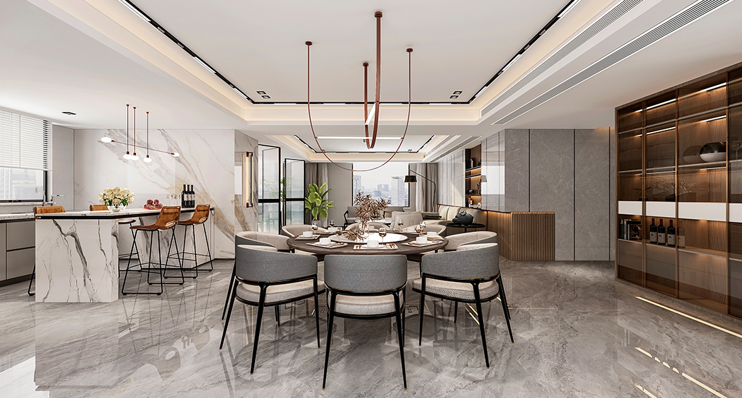 房子空間格局比較方正,南北通透,采光良好,在設(shè)計(jì)的時(shí)候加入了富有質(zhì)感的胡桃木木紋材質(zhì),搭配以大理石,整體空間高級(jí)感十足。