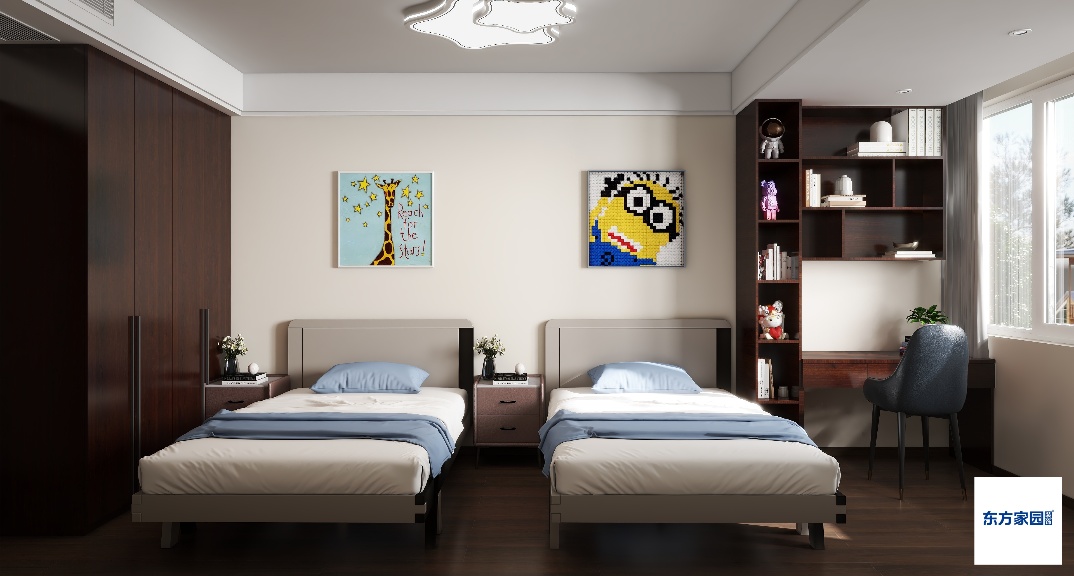 客戶收納多給他主臥做了一排長柜子,有兩個孩子不要上下鋪,由于空間足夠兩張成品床,分別做兩個獨立書桌,互不干擾,要求要新中式風格,動線流暢,布局合理。