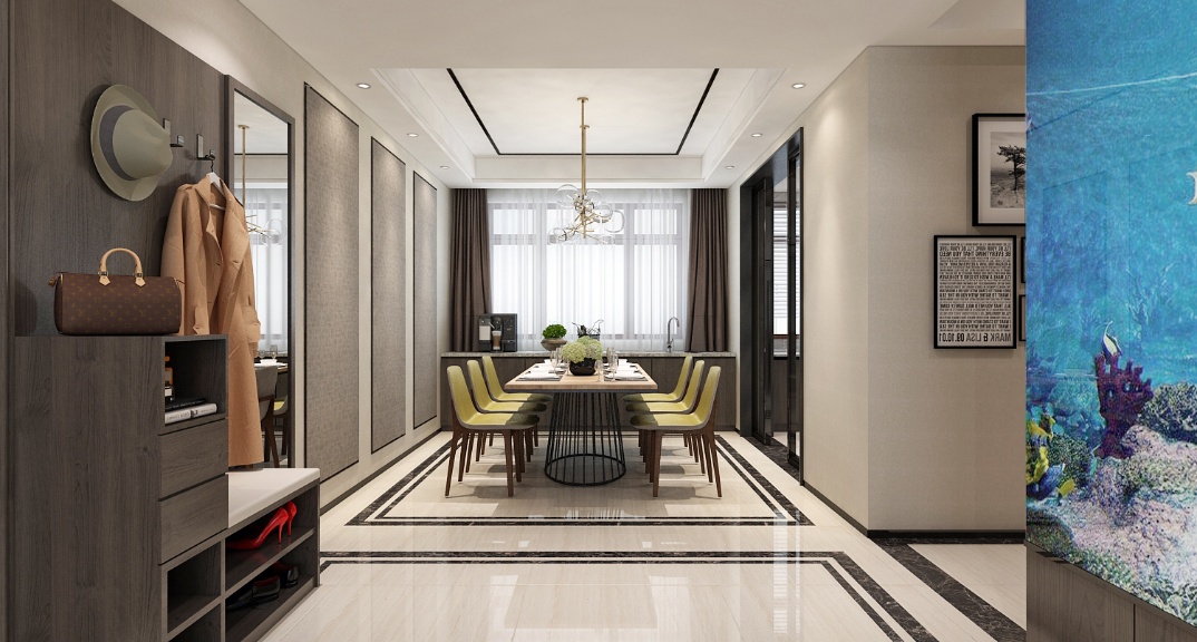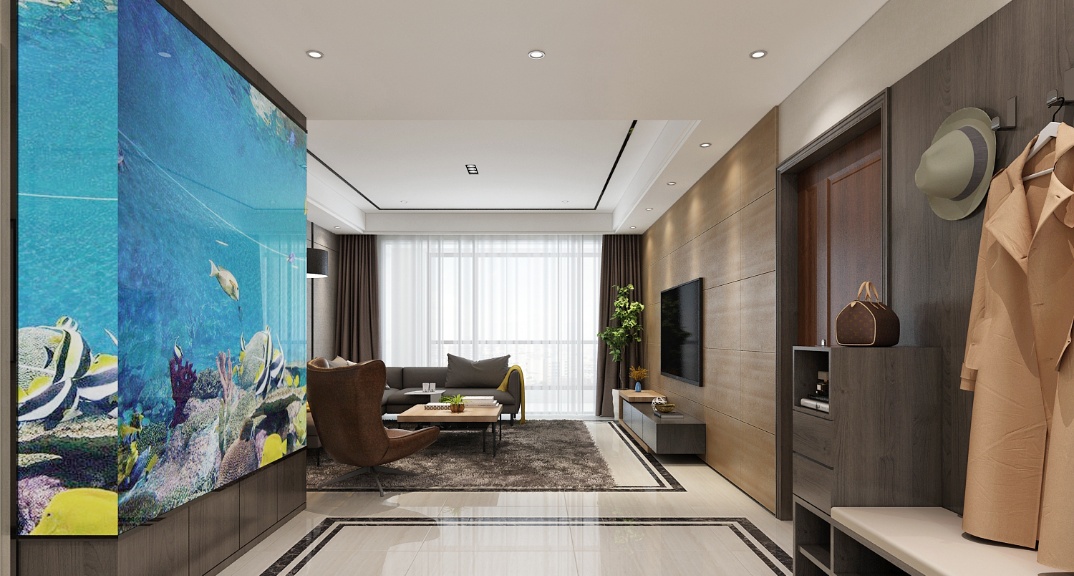 本案以現(xiàn)代港式風(fēng)格設(shè)計(jì),進(jìn)門的魚缸在靜止的空間中平添了一份靈動(dòng)靚麗的風(fēng)景線。客廳體現(xiàn)了主人的品味,地位,也是交友娛樂(lè)的場(chǎng)合,影視墻凹凸線條的護(hù)墻板很好的隱藏了孝親房的門讓整個(gè)空間融為一體。設(shè)計(jì)注重居室的實(shí)用性,而且還體現(xiàn)了工業(yè)化社會(huì)生活的精致與個(gè)性,符合現(xiàn)代人的生活品位。在處理空間方面以空間寬敞、內(nèi)外通透,在空間平面設(shè)計(jì)中追求不受承重墻限制的自由。墻面、地面、頂棚以及家具的陳設(shè)乃只燈具器皿等均以簡(jiǎn)潔的造型、純潔的質(zhì)地、精細(xì)的工藝為特征,強(qiáng)調(diào)形式體現(xiàn)出一定的文化品位。在色彩運(yùn)用上,選擇柔和的光線,加之原木色家具呈現(xiàn)生活自然舒適性。