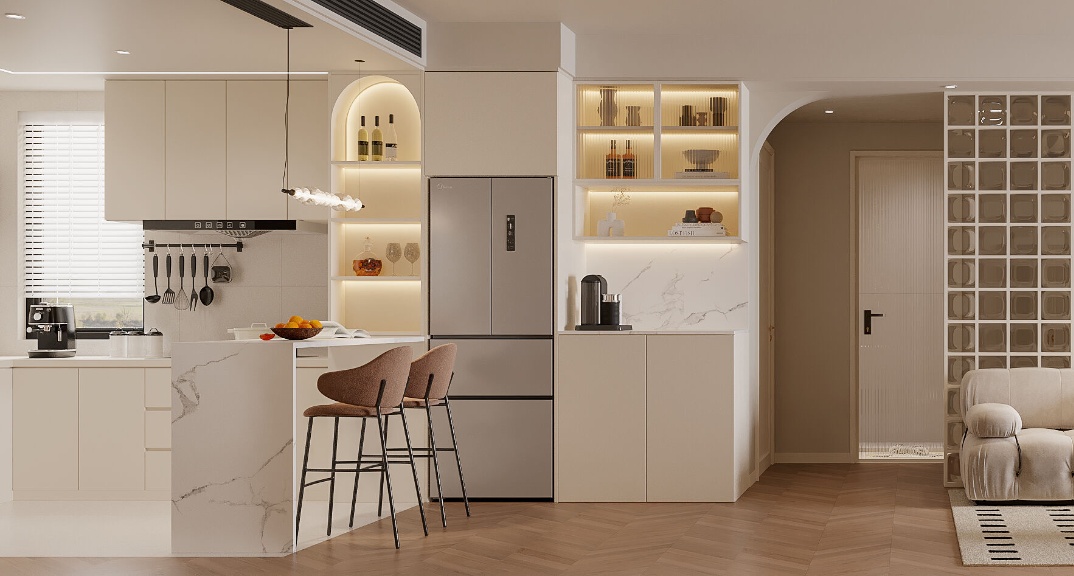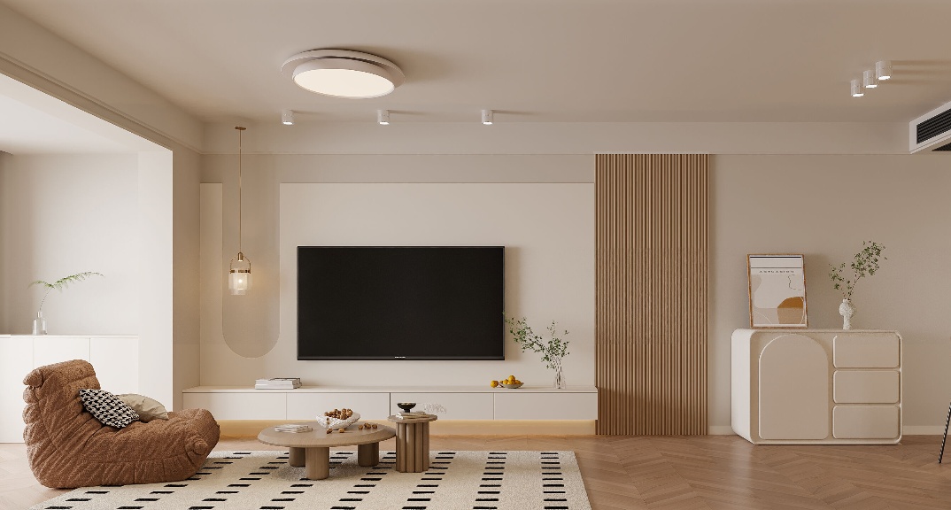 主要圍繞著開(kāi)放、明亮、互動(dòng)的設(shè)計(jì)理念進(jìn)行規(guī)劃。布局采用開(kāi)放式設(shè)計(jì),連接餐廳和廚房,形成一個(gè)流暢的活動(dòng)空間,增加家人之間的互動(dòng)性和空間的趣味性。效果上也讓整體空間顯得寬敞明亮。配色上主要以白色和原木色為主,家具選擇簡(jiǎn)潔大方的布藝家具,取消傳統(tǒng)的茶幾功能,采用可移動(dòng)的零食柜讓客廳有更多的可能性,突顯空間的寬敞感。燈光,采用多層次的照明設(shè)計(jì),包括主燈、射燈、壁燈和燈帶,營(yíng)造出溫馨的氛圍。