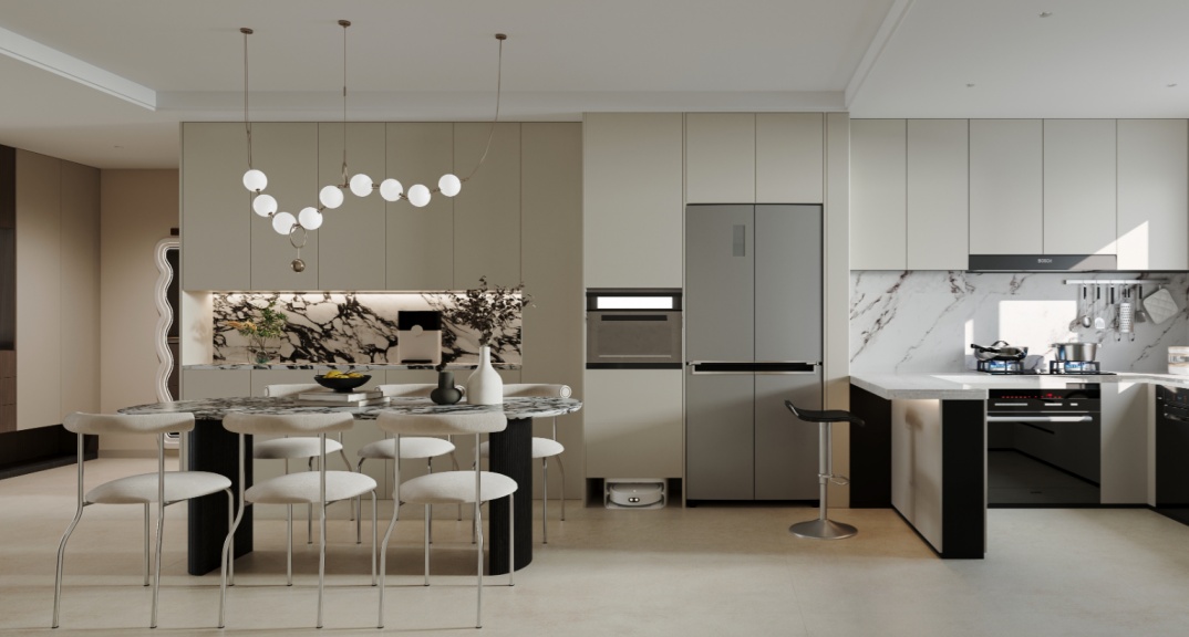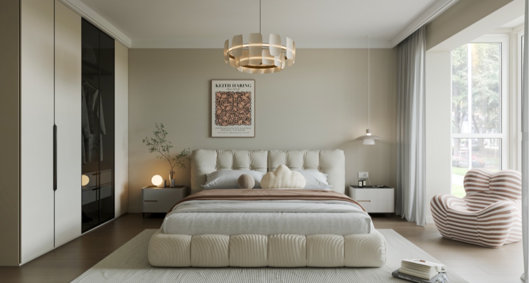 以中性色為主,搭配柔和的色彩點綴,營造寧靜而不失活力的空間氛圍。柔和的色調(diào)和質(zhì)感材料,打造寧靜的睡眠環(huán)境。墻面上以簡潔的裝飾畫和藝術(shù)品點綴墻面,增加空間的藝術(shù)感。