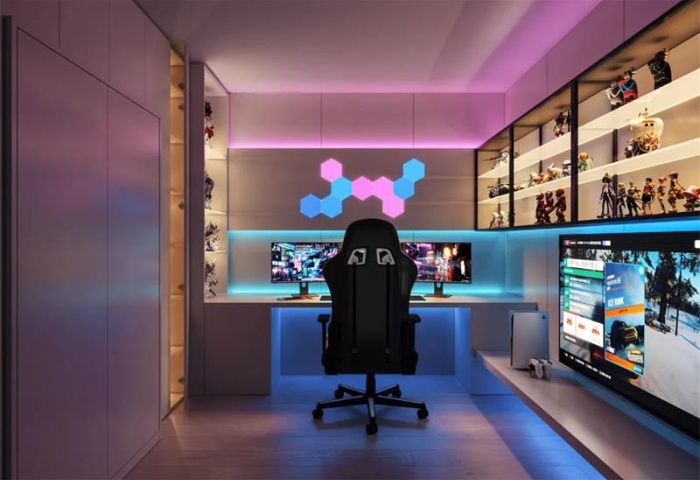 燈光設計在電競房中至關重要?;A照明可采用筒燈、燈帶或主燈,確??臻g日常功能正常。重點照明方面,屏幕掛燈是游戲區(qū)的絕佳選擇,既能避免視覺疲勞,又不占臺面空間。氛圍照明以 RGB 彩燈為主,設置在桌面、電腦屏幕后方等區(qū)域,瞬間營造出滿滿的電競氛圍感。