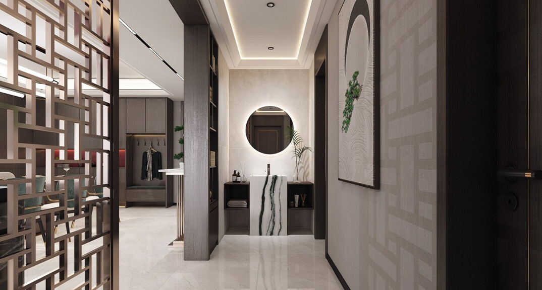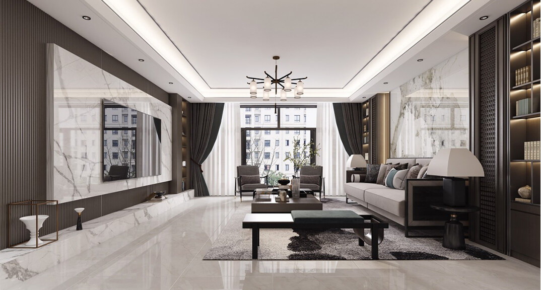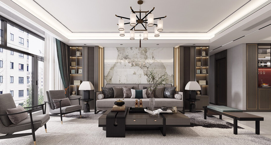 綠城·海棠印月166㎡三室二廳客廳新中式風(fēng)格裝修案例效果圖