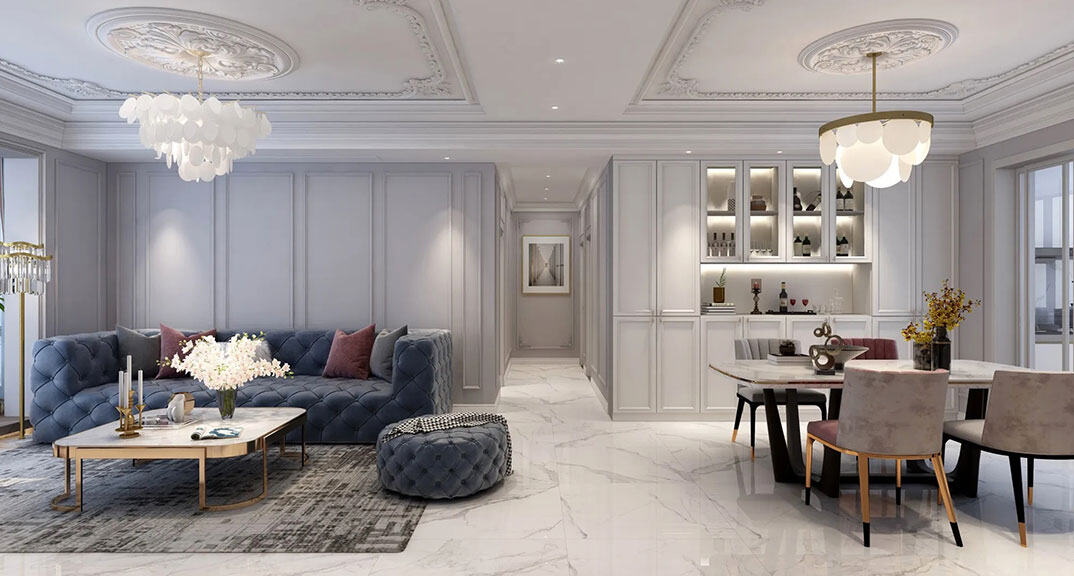 御苑小區(qū)137㎡三室二廳客廳沙發(fā)餐廳法式輕奢風格裝修案例效果圖