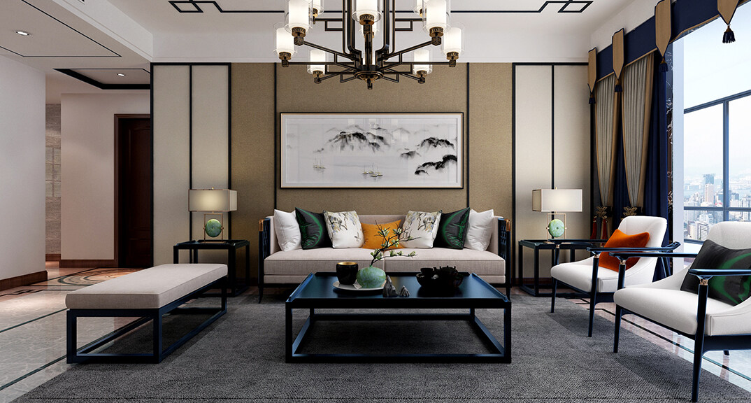安泰悅湖灣138㎡三室兩廳客廳沙發(fā)新中式風(fēng)格裝修案例效果圖