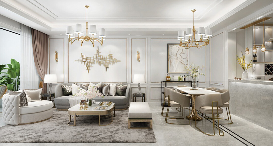 和達璟城128㎡洋房別墅客餐廳吧臺輕奢風(fēng)格裝修案例效果圖
