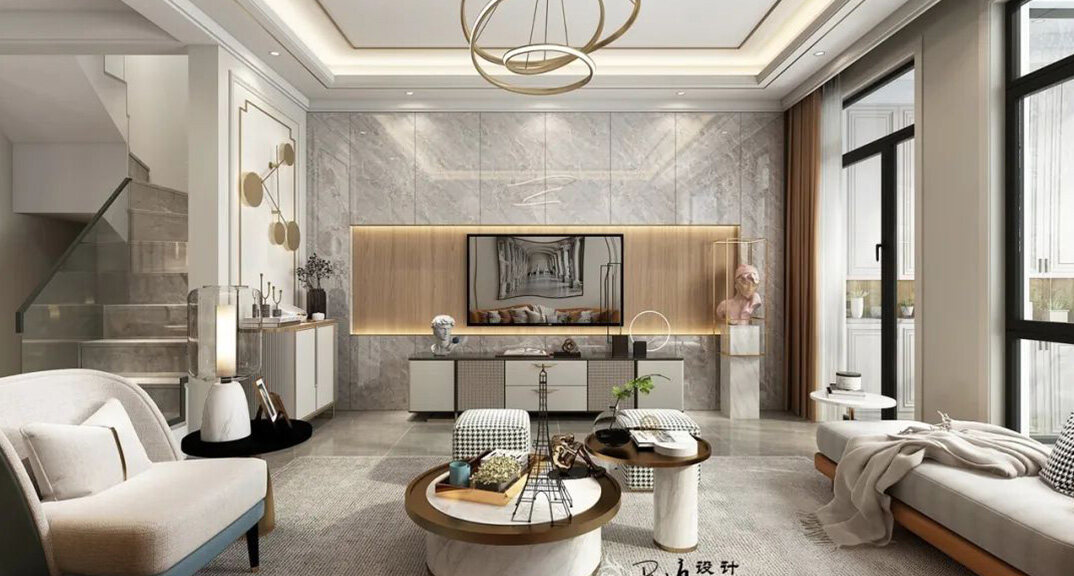 原筑300㎡別墅客廳電視現(xiàn)代輕奢風格裝修案例效果圖