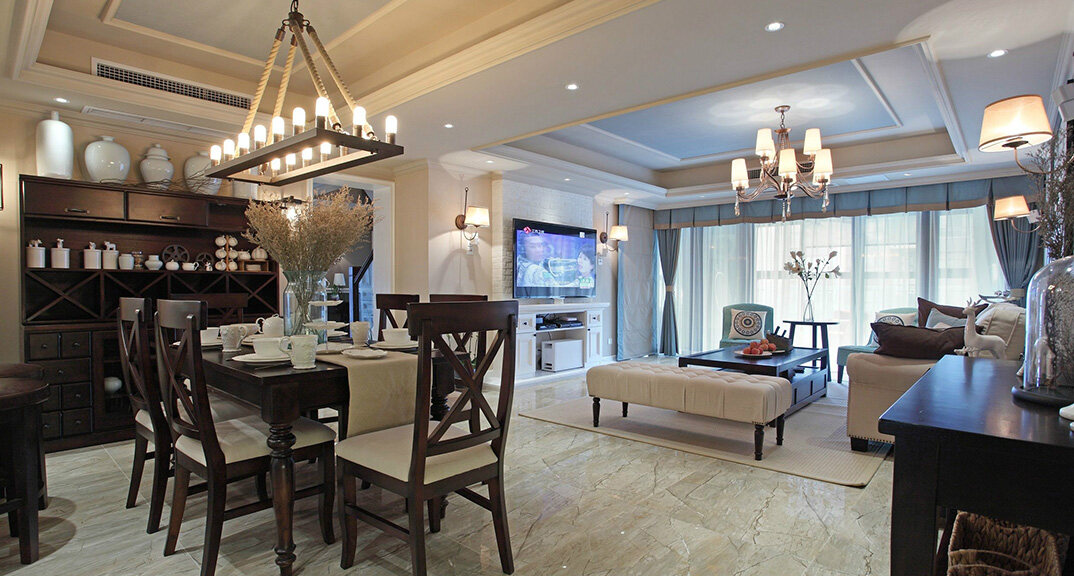 檀府300㎡別墅客餐廳現(xiàn)代美式風(fēng)格裝修案例效果圖