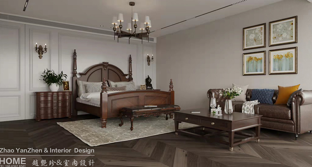 璞麗豪庭287㎡疊拼上疊一樓主臥美式輕奢風(fēng)格裝修案例效果圖